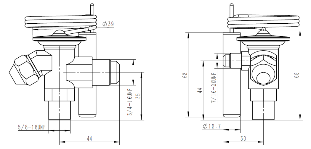 TIシリーズ温度膨脹弁は温度センサーと外(内)平衡管により蒸発器の輸出の過熱を感知し、蒸発器冷媒の供給量を調整する。